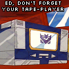 Because everyone has cassette-players with the Decepticon logo all over them. Honestly, people in this cartoon are so dumb.