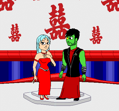 In my world, Matrix and AndrAIa got married long before they found the system with no name. The marriage took place in a nice little Oriental system, between Games. Made with Kim "Slack" McFarland's KiSS dolls.